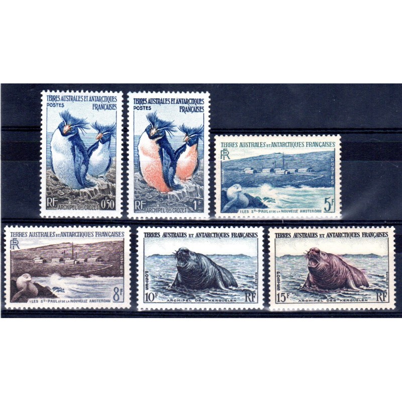 Faune, manchots gorfous, otarie et baraquements, éléphant de mer.