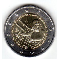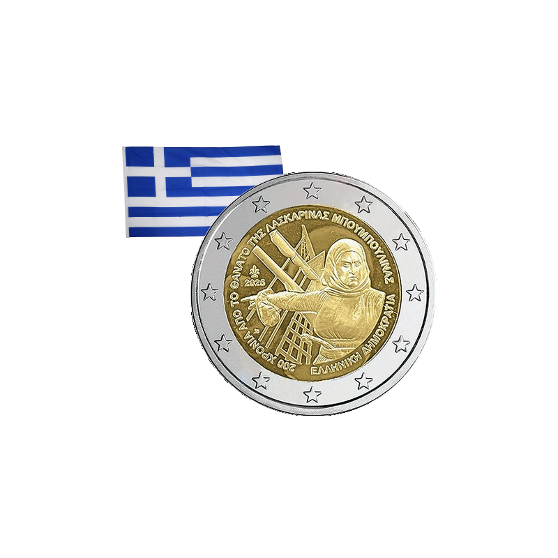 Pièce de 2 euros commémorant les 200 ans de la mort de Laskarina Bouboulina, héroïne de la marine et une figure importante de la lutte pour l'indépendance grecque contre l'Empire ottoman.