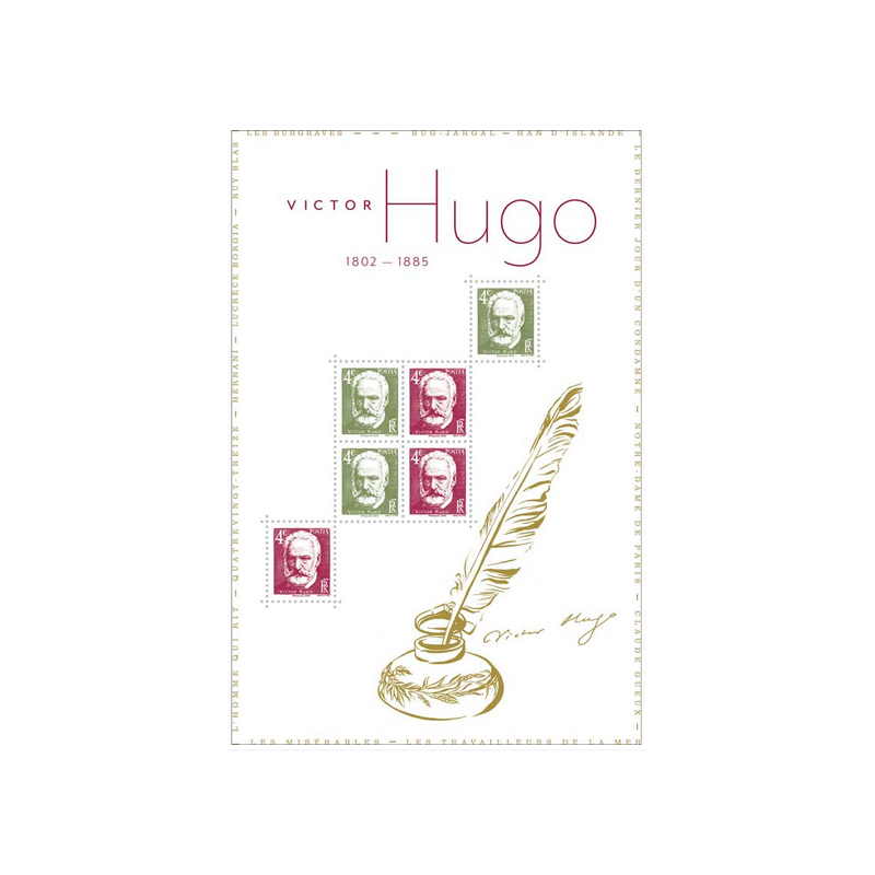 Ce bloc à tirage limité célèbre le 140e anniversaire de la mort de Victor Hugo Ce bloc de 6 timbres rend hommage à l’auteur des Misérables, figure majeure de la littérature française et mondiale, et symbole républicain. Il inclut la reprise fidèle d’un timbre émis en 1935 pour le 50e anniversaire de sa disparition. Dessiné et gravé en taille-douce par Achille Ouvré, ce timbre représente Victor Hugo dans ses dernières années.