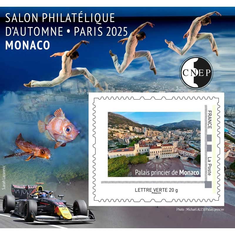 Le timbre personnalisé auto-adhésif représente une vue aérienne du Palais princier et de la ville de Monaco. Le bloc fait référence aux Ballets présentés à l'Opéra Garnier de Monte-Carlo, au Grand Pris automobile et au musée océanographique de Monaco