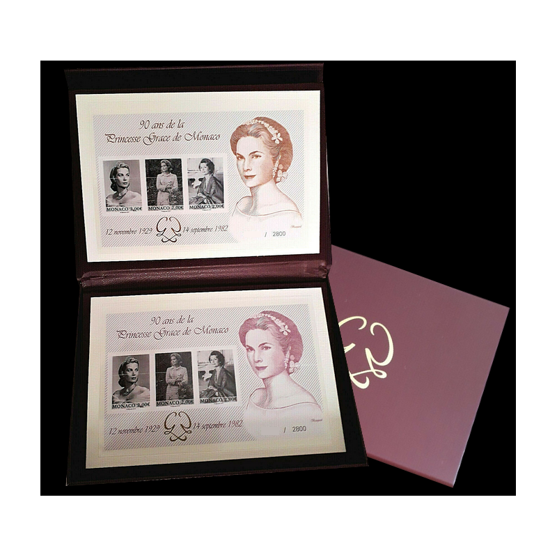 Coffret présentant deux blocs non dentelés et numérotés en taille douce, offset et dorure à chaud, émis en l’honneur des 90 ans de la princesse Grace de Monaco.