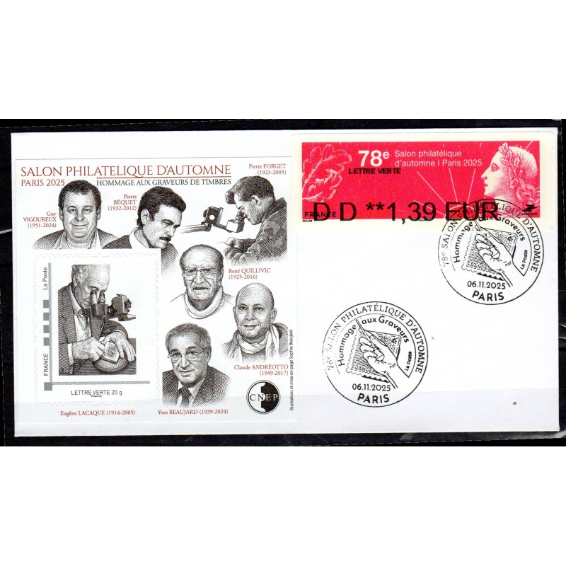 Souvenir philatélique du Salon Philatélique d'Automne Paris 2025. Bloc de la CNEP rendant hommage aux graveurs de timbres, LISA du Salon sur la Marianne de Muller et cachet de l'évènement.