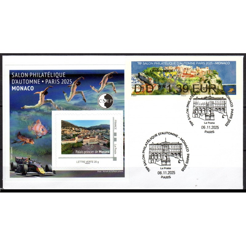Souvenir philatélique du Salon Philatélique d'Automne Paris 2025. Bloc de la CNEP consacré à la principauté de Monaco, LISA du Salon sur Monaco et cachet de l'évènement.