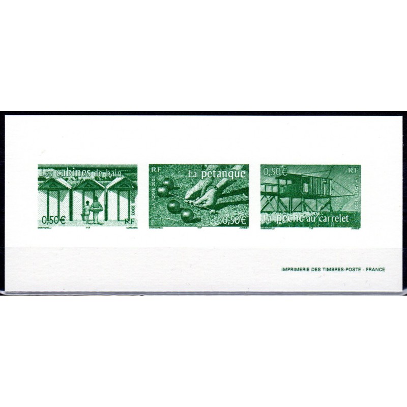 Gravure du timbre "Portraits de région". Les cabines de bain, La pêche au carrelet et la pétanque.