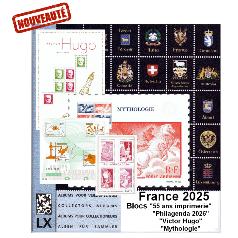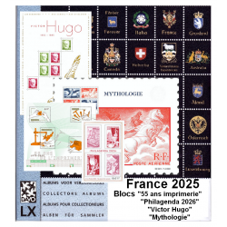 Jeu de base pour les blocs "55 ans Imprimerie", "Philagenda 2026", Victor Hugo" et "Mythologie" émis en 2025.