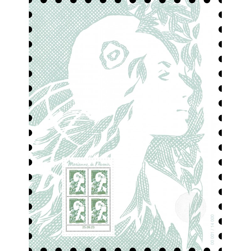 Feuillet-affiche dentelé gommé contenant un bloc daté de 4 timbres Marianne de l'Avenir à la valeur de 7€