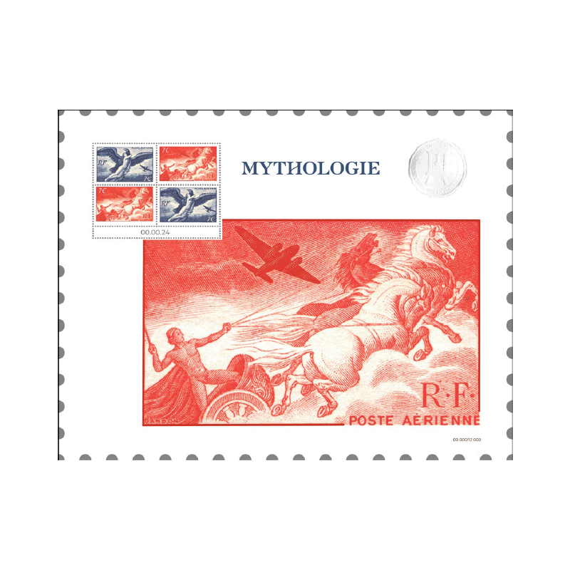 Feuillet-affiche dentelé gommé contenant un bloc daté de 4 timbres à la valeur de 7€. 2 timbres "Apollon conduisant le char du soleil" et 2 timbres "Égine enlevée par Jupiter métamorphosé en aigle"