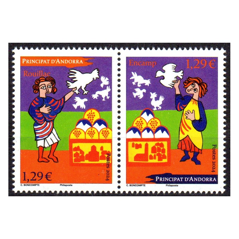 Le jumelage de villes est un concept par lequel les villages ou les villes de différentes zones géographiques et politiques se rejoignent pour promouvoir les relations culturelles. Normalement, bien que ça ne soit pas obligatoire, les villes jumelées ont des caractéristiques semblables. Le jumelage de la paroisse d’Encamp avec Rouillac date du 14 juillet 1968, officiellement signé le 30 mars 1969 et ratifié le 28 août 1992 par les autorités politiques des deux villes. Rouillac est une petite ville française située dans la région Nouvelle-Aquitaine. Ce timbre commémore cet attachant événement. Ni plus ni moins que le 55e anniversaire du jumelage de Rouillac et Encamp.